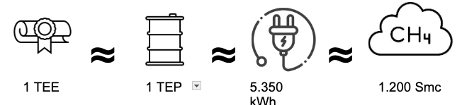 Un Titolo di Efficienza Energetica (TEE) corrisponde a 1 TEP di risparmio che si traduce in circa 5.350 kWh di energia elettrica o 1.200 Smc di metano. Un TEE vale circa 250 €, valore però variabile sul mercato GME.